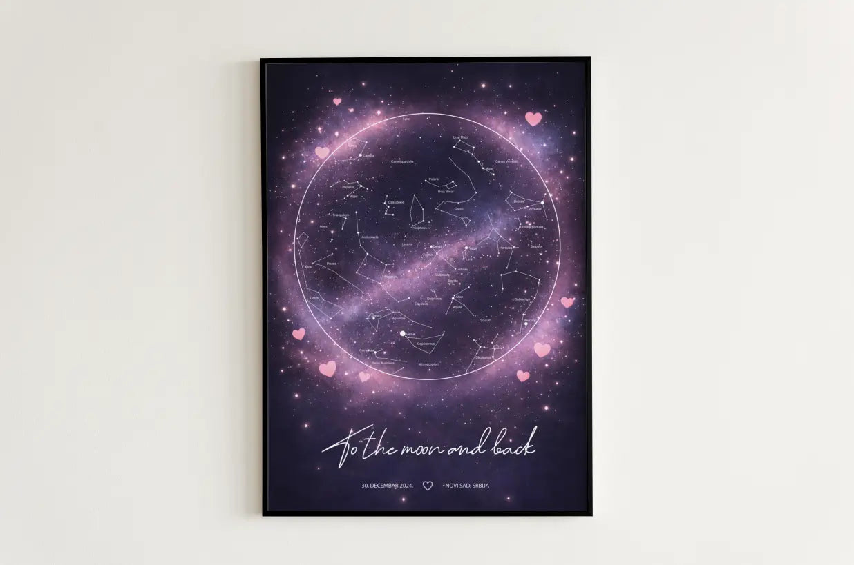 Zvezdana Mapa – Love Galaxy je romantična verzija mape neba. Prikazuje tačan raspored zvezda, sazvežđa i planeta na datum i lokaciju koje izaberete, uz nežnu galaktičku pozadinu u tonovima ljubičaste i roze boje.