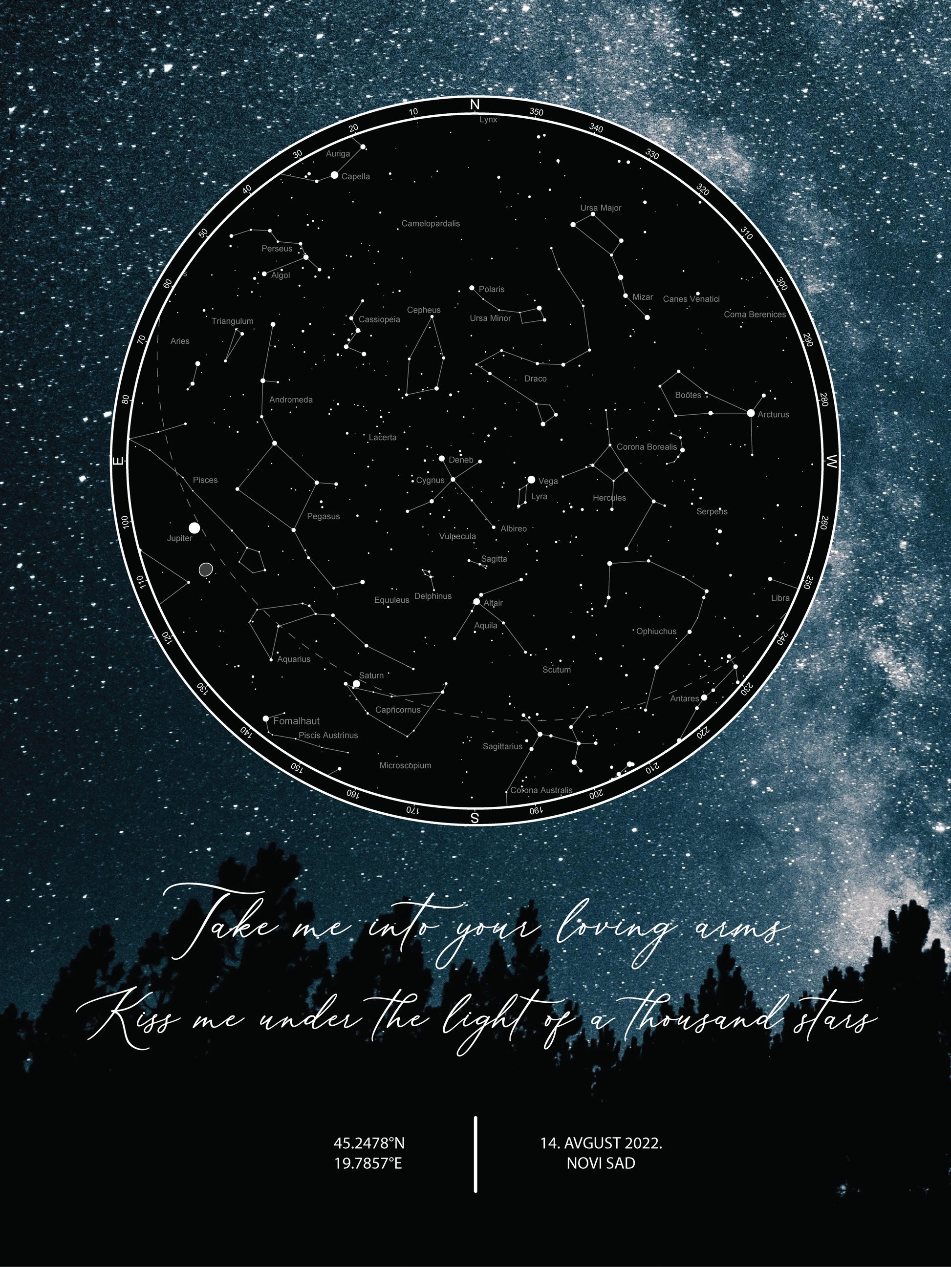 Prilikom naručivanja zvezdane mape molimo da ne zaboravite da dodate datum, mesto i tačno vreme, kao i Vaš unikatan citat.