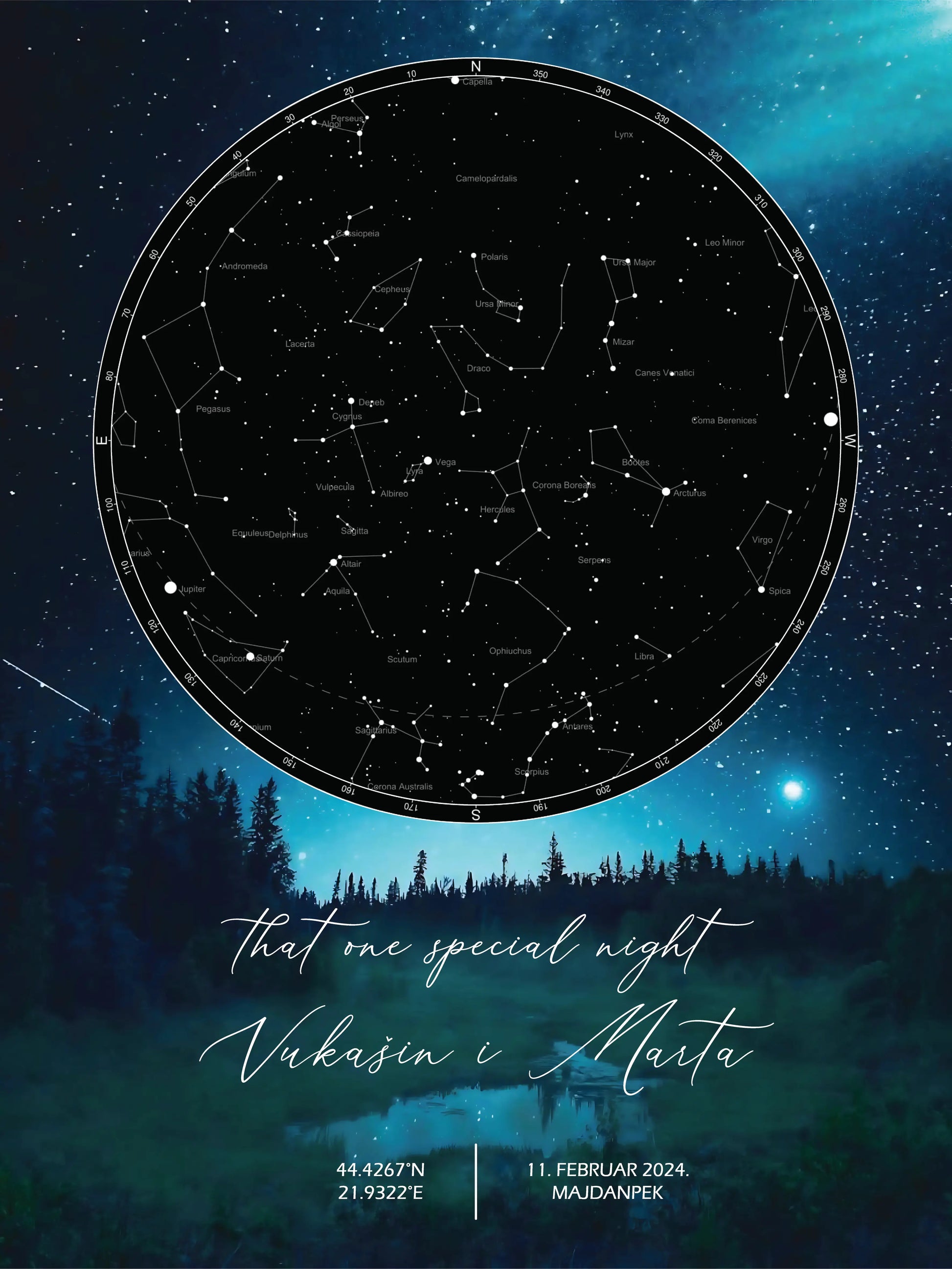 Jedinstvena zvezdana mapa sa pozadinom koja predstavlja šumu. Visok kvalitet pozadine koji se ne gubi pri izradi. Unikatan poklon za voljene.